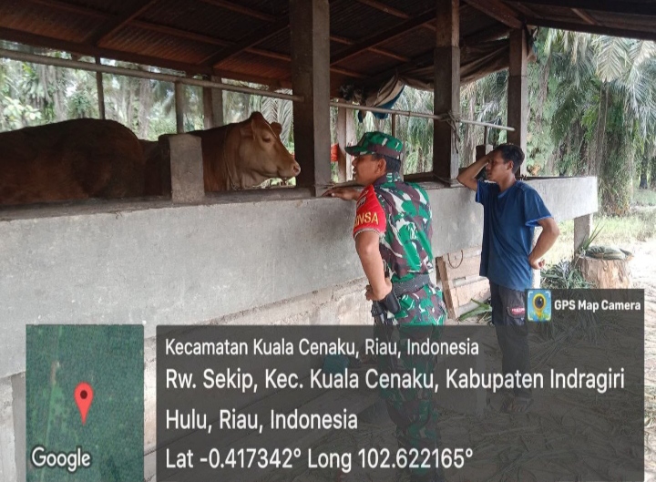 Suaralira.com, Rengat - Guna untuk Mengantisipasi timbulnya kembali penyebaran wabah Penyakit Mulut dan Kuku (PMK) pada hewan ternak di wilayah desa binaannya, Sertu Togu JN Babinsa Koramil 01/Rengat melaksanakan pemantauan secara langsung kesehatan hewan ternak milik bapak Wartono.
