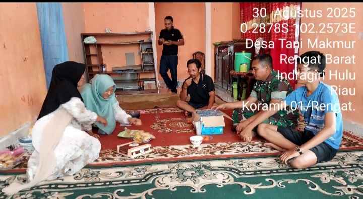 Suaralira.com, Rengat - Babinsa Koramil 01 /Rengat Kodim 0302/INHU Serda Hadi. S melaksanakan Komunikasi Sosial (Komsos) dalam rangka pembinaan teritorial (Binter) dengan warga binaan bertempat di rumah warga di Desa Tani Makmur , Kecamatan Rengat barat, Sabtu (30/08/2025).