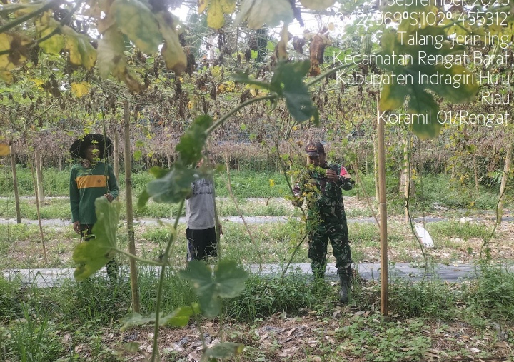 Seda Edi putra Babinsa Koramil 01/Rengat Kodim 0302/Inhu jalankan komsos dengan bapak Tomi petani yang sedang merawat tanaman gambas yang ada di kebun nya yg terletak di desa talang jerinjing kecamatan rengat barat Kabupaten Indragiri hulu, Minggu (21/09/2025).