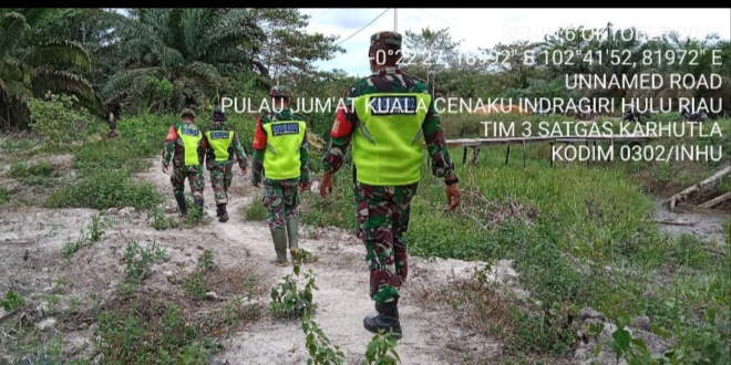 Suaralira.com, Rengat - Rutinitas kegiatan Patroli dan sosialisasi Karhutla Wilayah Teritorial Pencegahan Karhutla Koramil 01/Rengat Kodim 0302/Inhu di Desa Pulau Jumat Kecamatan Kuala Cenaku Kabupaten Indragiri Hulu, Senin (01/10/2025).