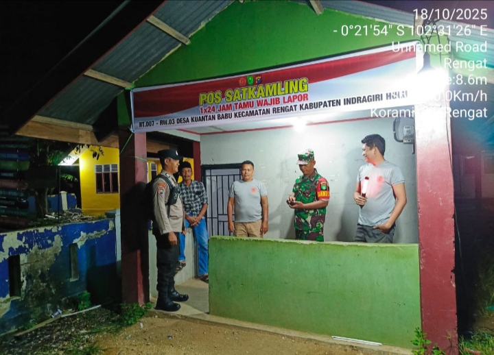 Suaralura.com, Rengat - Guna untuk menjaga keamanan dan ketertiban masyarakat (kamtibmas), Babinsa Desa Kuantan Babu Pelda Sumarno Koramil 01/Rengat Kodim 0302/Inhu melaksanakan patroli siskamling bersama warga pada Sabtu (18/10/2025) malam.