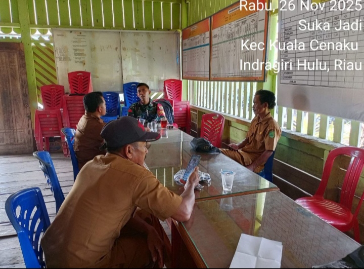 Suaralira.com, Rengat - Demi mewujudkan wilayah yang aman dan kondusif Babinsa Koramil 01/Rengat Kodim 0302/Inhu Praka Darusman Said melaksanakan Komsos dengan Kades dan staf di kantor Desa Suka Jadi Kecamatan Kuala Cenaku Kabupaten Indragiri Hulu Prov Riau, Rabu (26/11/2025).