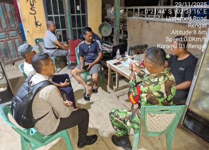 Suaralira.com, Rengat - Babinsa Desa Kuantan Babu, Koramil 01/Rengat, Kodim 0302/Inhu Pelda Sumarno melaksanakan kegiatan Komunikasi Sosial (Komsos) bersama warga masyarakat Desa Kuantan Babu, Kecamatan Rengat, Kabupaten Indragiri Hulu, Sabtu malam (29/11/2025).