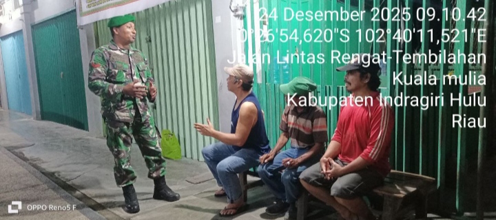Suaralira.com, Rengat - Upaya yang dilakukan oleh Babinsa Koramil 01/Rengat Koptu Mukhlis melaksanakan kegiatan patroli Siskamling di wilayah Teritorial Koramil 01/ Rengat Kecamatan Rengat, Kabupaten Indragiri Hulu, Rabu malam (25/12/2025).